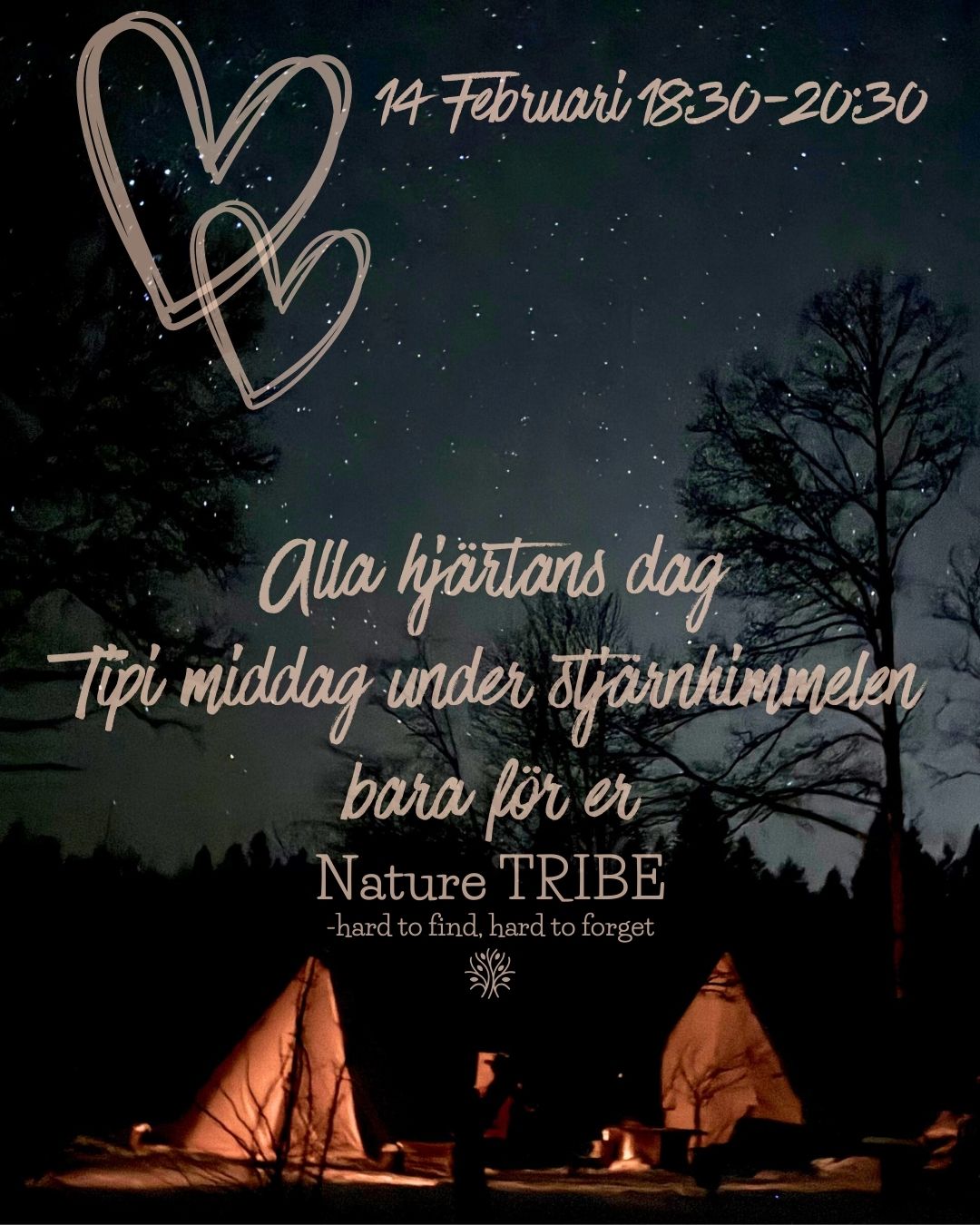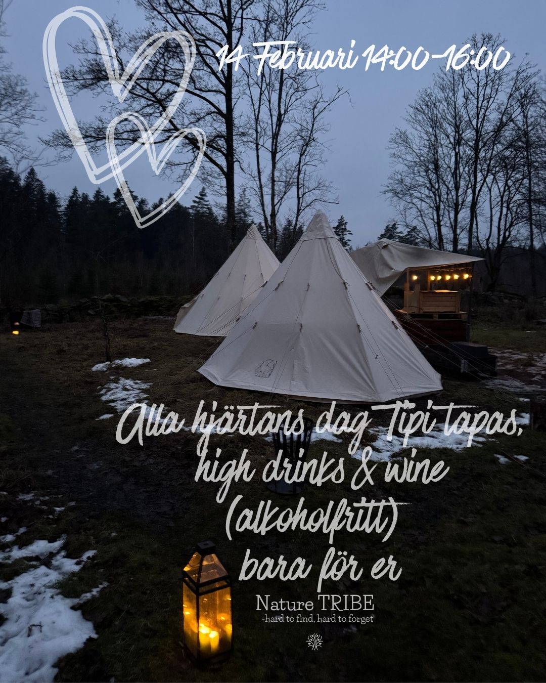 Välkomna att njuta av en alla hjärtans eftermiddag i Tipi´n bara för er två. Dagen startar 14:00 och det serveras smårätter "tapas style" med charkuteri, ost och massa annat gott, det serveras med matchande alkoholfria vin och drinkar.